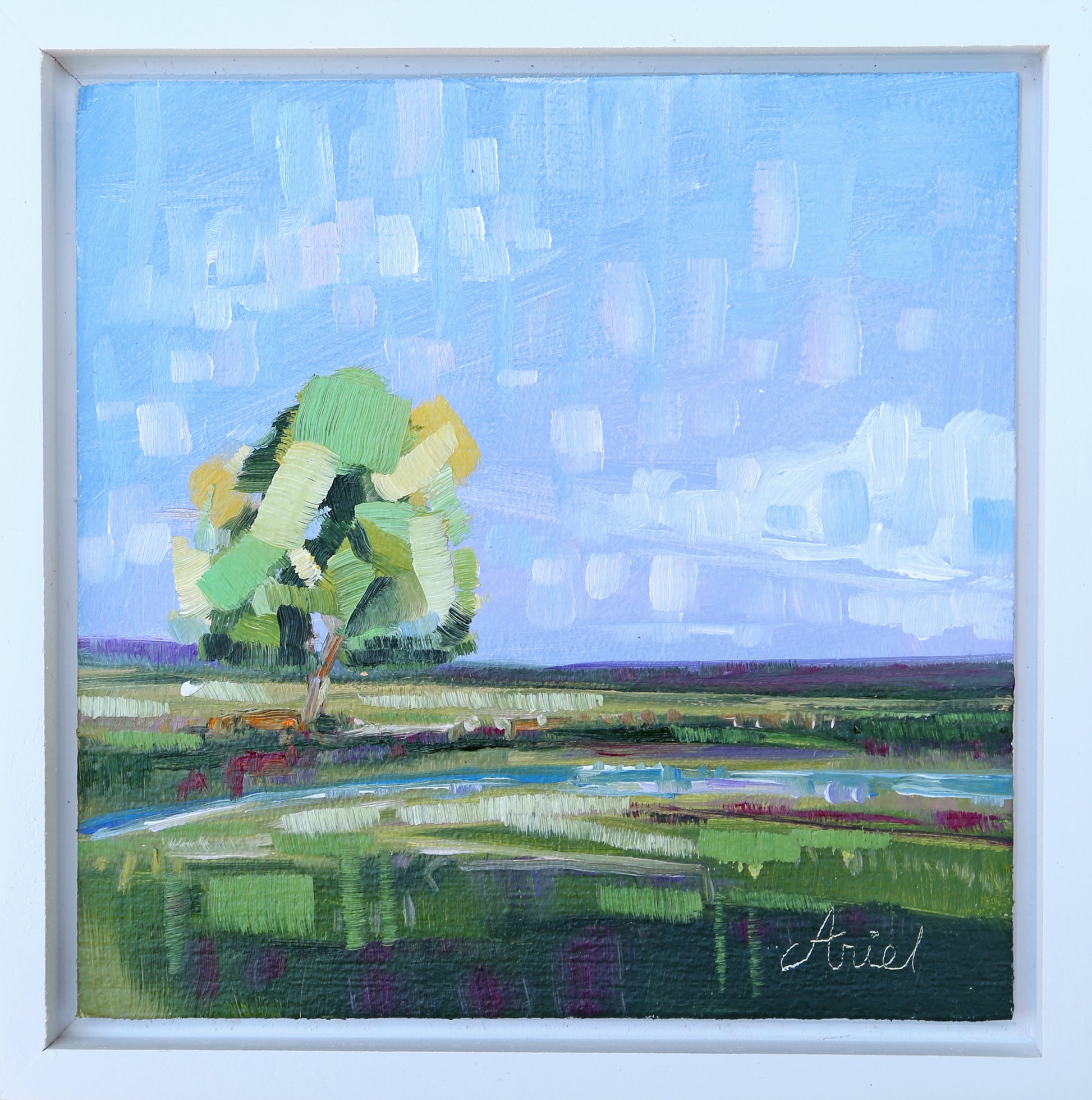 This piece comes with a white, solid wood floater frame, hand-crafted in studio. Total size of piece including frame is 5 ¾ ” x 5 ¾”.